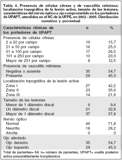 El estudio incluyó portadores de uveítis posterior activa presumiblemente por Toxoplasma gondii, y describe frecuencia de variables clínicas y biológicas, avaliadas en la primera consulta, durante el período comprendido entre enero de 2002 hasta diciembre de 2005, en el Hospital de las Clínicas de la Universidad Federal de Pernambuco.