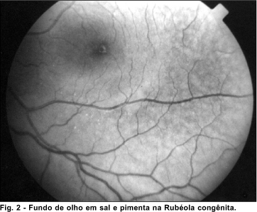 A retinopatia pigmentar ou em sal e pimenta é a lesão ocular mais comumente encontrada relacionada à rubéola congênita e é caracterizada por áreas de hiperpigmentação e áreas de hipopigmentação do epitélio pigmentário da retina. Outras lesões oculares que podem estar associadas são: catarata, glaucoma, microftalmia, iridociclite, nistagmo, alta miopia e estrabismo.