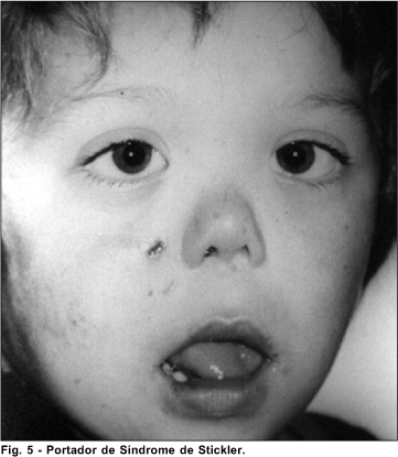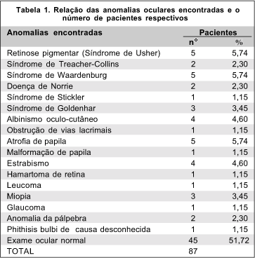 No presente trabalho, o exame clínico oftalmológico completo revelou alterações oculares em cerca de metade dos pacientes. Dos 87 pacientes examinados, 5 (5,74%) com Síndrome de Usher, 2 (2,30%) com Síndrome de Treacher-Collins, 5 (5,74%) com Síndrome de Waardenburg, 2 (2,30%) com Doença de Norrie, 1 (1,15%) com Síndrome de Stickler, 3 (3,45%) com Síndrome de Goldenhar e 4 (4,60%) com Albinismo oculo-cutâneo.