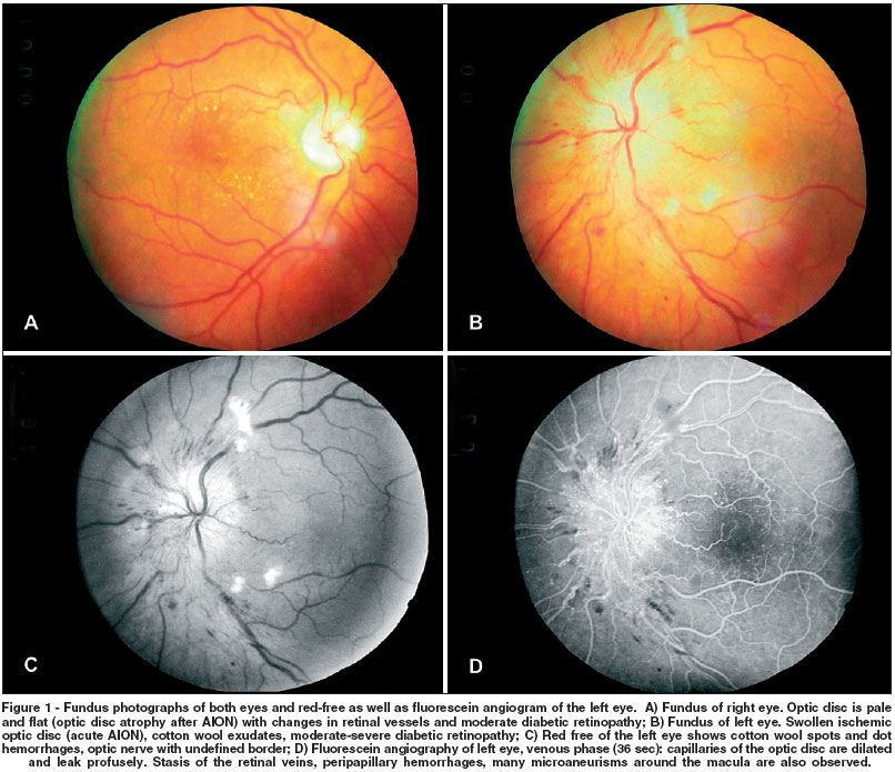 In our first patient, retinal vascular complications include optic disc atrophy after AION in his right eye and acute AION in left eye within six months. After this second eye complication, he was submitted to a strict treatment for obesity, diabetes, HTA and HLP. VA in the right eye improved partially. Clinical features and VA in the left eye improved as well.