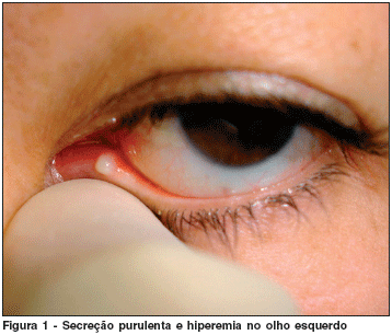 Ao exame clínico inicial apresentava dilatação, hiperemia e edema do ponto lacrimal inferior com saída de secreção purulenta, por este, à expressão (Figura 1).