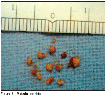A cirurgia realizada foi canaliculotomia preservando o ponto lacrimal onde se observou, após curetagem exaustiva, saída de grande quantidade de secreção e dacriolitos. (Figuras 2 e 3).