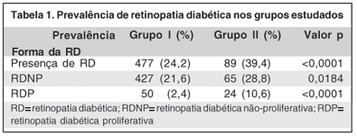 Em relação à freqüência da retinopatia diabética, entre os pacientes do grupo I, 477 (24,2%) diabéticos apresentavam esta complicação, enquanto que no grupo II encontrou-se em 89 (39,4%) pacientes. A freqüência de RDNP para o grupo I foi de 427 (21,6%) pacientes e para o grupo II, 65 (28,8%) pacientes. Em relação à RDP, encontraram-se 50 (2,4%) pacientes no grupo I e 24 (10,6%) pacientes no grupo II (Tabela 1).