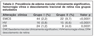 O descolamento tracional da retina foi encontrado em 24 (1,2%) pacientes do grupo I e em 9 (4,0%) do grupo II. No grupo I, 16 (0,8%) pacientes apresentavam hemorragia vítrea e no grupo II, 15 (6,6%) pacientes. Encontrou-se edema macular clinicamente significativo em 44 (2,2%) pacientes do grupo I e 22 (9,7%) pacientes do grupo II (Tabela 2).