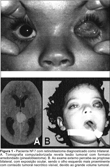 1- Sete pacientes portadores de retinoblastoma foram tratados com quimioterapia durante o período de Fevereiro/98 a Setembro/99, 4 eram do sexo masculino. Três casos eram unilaterais 3 bilaterais e 1 trilateral (Fig.1.A e 1.B, caso nº 7). Nenhum dos pacientes tinha história familiar de retinoblastoma.