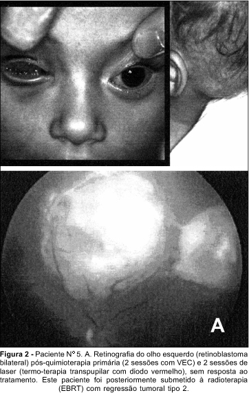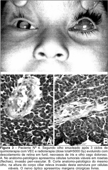 5 - Os pacientes foram distribuídos de acordo com a presença ou não de doença extra-ocular no momento do diagnóstico: GrupoI- Cinco pacientes receberam quimioterapia como tratamento primário, 4 obtiveram redução tumoral sendo que 2 responderam apenas inicialmente indo a óbito em 10 meses de média. O número de ciclos de quimioterapia usado foi em média de 3 (variando de 2 a 5 ciclos). O tempo médio de seguimento após quimioterapia primária foi de 12,4 meses (variação 6-18 meses) até o presente momento. Dois pacientes desenvolveram metástase após início da quimioterapia primária. Quatro pacientes foram submetidos à enucleação do pior olho, ou olho preenchido por tumor. Um paciente (Fig.2, caso nº 5) apresentou sementes vítreas durante o tratamento com quimio e laser (termo-terapia), como já havia sido enucleado o olho pior (grupoV), necessitou tratamento complementar com radioterapia (EBRT). Atualmente, 4 meses pós EBRT, apresenta regressão tipo 2 das lesões intra-oculares e visão 20/25. Outro paciente (caso nº 4) tratado com radioterapia (EBRT) no olho menos acometido, foi submetido a enucleação do segundo olho devido a descolamento da retina em funil com fibrose e calcificação após a radioterapia. O anatomo-patológico revelou que mesmo o segundo olho enucleado continha células tumorais viáveis (Fig. 3.A) e invasão do corpo ciliar (Fig. 3.B). GrupoII- Dois pacientes submetidos a enucleação primária com quimioterapia adjuvante, média de 3 ciclos (variando de 2 a 5 ciclos). Estes já apresentavam metástase cerebral e foram a óbito em média aos 4,5 meses de seguimento. Esse grupo foi submetido a enucleação imediatamente após diagnóstico por serem casos avançados com comprometimento extra-ocular e grande volume tumoral. A intervenção cirúrgica teve como objetivo diminuir a massa tumoral a ser tratada.