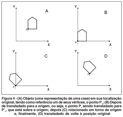 Como podemos ver pela figura 4A, temos inicialmente um objeto cujas coordenadas (x, y) de todos os pontos são conhecidas. Vamos supor que desejamos rotacionar este objeto (como exemplo aqui, o formato de uma casa) em torno de um de seus vértices, representado aqui pelo ponto P1. Para que esta tarefa de transformação seja possível, temos que, inicialmente, transladar o objeto para o centro do sistema de coordenadas. Esta operação de translação está representada pela figura 4B. Depois podemos aplicar a operação de rotação em torno de P'1. Desta maneira percebemos que nestas operações há um princípio interessante em que a operação de rotação deve ter seu eixo de rotação centrado na origem (Figura 4C). Finalmente, após a rotação desejada, o objeto pode ser novamente transladado de volta para a localização original, mas desta vez com todas os seus pontos rotacionados em torno do ponto de referência original P1 (Figura 4D).
