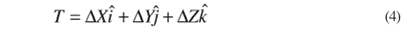 ou seja, onde cada um dos termos em delta representam as respectivas translações em cada direção, que são então multiplicados pelos vetores unitários (versores i, j e k) em cada uma destas direções. Para compreender como se calcula cada um destes componentes podemos nos basear no digrama da figura 6.