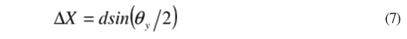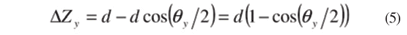 O diagrama da figura 6 ilustra duas situações distintas: primeiro aquela em que as coordenadas do olho são as mesmas do videoceratógrafo, portanto não havendo rotação ou translação; segundo, a situação em que o olho rotacionou de um ângulo q em torno do eixo Y (para olhar para o LED 3, por exemplo). Nesta situação o videoceratógrafo terá que deslocar de DZy para focalizar corretamente o instrumento, pois o ápice na posição anterior (ponto A) passou para uma nova posição (ponto B), não sendo mais localizado no ápice original depois de rotacionado (ponto C). Da figura pode-se determinar, fazendo-se a aproximação de que o novo ápice (ponto B) está a meio caminho em termos de rotação total do olho (do ponto A para o ponto C), sendo então o deslocamento dado por: