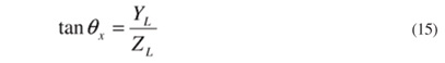 Como pode-se ver, faz-se necessário o conhecimento dos ângulos qx e qy . Usando o diagrama da figura 5 fica mais fácil compreender estes cálculos, que serão demonstrados aqui apenas para o ângulo qx. A figura 5 representa um olho que está fixando o olhar sobre um LED cujas coordenadas (XL, YL, ZL) com relação ao sistema de coordenadas do cone (X', Y', Z') são muito bem conhecidas. Fazendo-se a aproximação de que o centro de rotação do olho (Zrc, na figura 5 representado por d) é estático e conhecido e que o videoceratógrafo, através de suas câmeras laterais, fornece a distância do ápice da córnea até o LED (Za), podemos escrever: