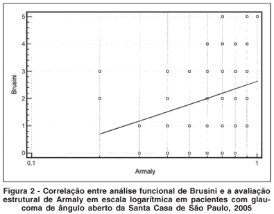 Na análise gráfica, a correlação entre a avaliação estrutural de Armaly e a análise funcional de Brusini foi colocada em escala logarítmica, para ser melhor observada.