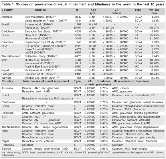 In a recent estimate of the World Health Organization (WHO), Brazil was included in a subregion along with Barbados and Paraguay, where the estimate of blindness prevalence in individuals over 50 years old was 1.3%, representing almost a million people(1). Table 1 shows several recent studies around the world on the prevalence of visual impairment and blindness, as well as the major causes and the parameters used to define them in populations with 40 years and older.