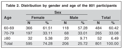 Table 2 shows age and gender distribution of the 801 participants. Most of them were females (74.28%) and 60.42% were less than 70 years old.