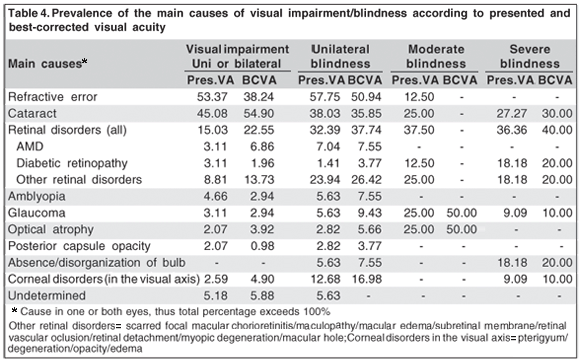 Main causes of visual impairment and blindness (presenting VA and BCVA) are shown in table 4. Individuals with visual impairment or blindness may have different causes for it in each eye. These cases are represented twice - once for each cause. Taking the presented VA into consideration, the most common cause for visual impairment and unilateral blindness was uncorrected refractive error. Cataract was the main cause of visual impairment and blindness, following adequate optical correction.