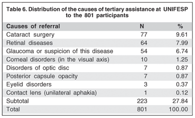 The main reasons for tertiary referral of the 223 (27.84%) elderly to the Institute of Vision are shown in table 6. Elderly who needed referrals could have different causes of visual impairment in each eye. These cases were represented twice - once for each cause. Considering BCVA, cataract surgery was the main reason of referral in 77 (9.61%) cases. Other important reasons for referrals consisted of retinal disorders in 64 (7.99%), for diagnostic confirmation, follow-up and/or glaucoma treatment in 54 (6.74%) and for corneal disorders in 10 (1.25%).