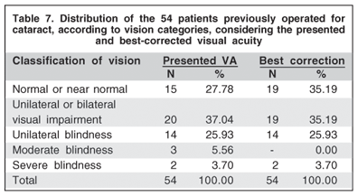 Fifty-four (6.74%) of the 801 elderly examined had been previously submitted to cataract surgery; 27 in one eye only and 27 in both eyes. The distribution of the 54 patients previously submitted to cataract surgery, according to the classification of vision with the presented and best-corrected VA is shown in table 7.