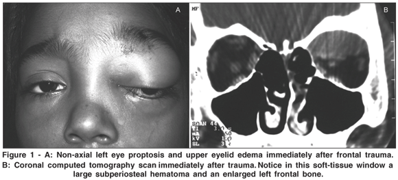 An 11-year-old girl with SCD presented to the emergency room with visual loss after being hit in the left frontal region by a mud pie. On examination, the left eye was grossly proptotic with inferolateral dystopia, important eyelid swelling and afferent pupillary defect (Figure 1A). Visual acuity was 20/20 in the right eye and counting fingers in the left eye. Slit lamp examination was normal in both eyes. Computed tomography of the orbits showed a superomedial subperiosteal hematoma (Figure 1B). The patient underwent an urgent canthotomy, cantholysis and drainage of the hematoma through a lid crease approach. On the first postoperative day proptosis was reduced, the pupillary reflexes were normal and the visual acuity improved to 20/40. However, as the globe displacement persisted the patient was transferred to the Oculoplastic Clinic of the School of Medicine of Ribeirão Preto. A second CT scan of the orbits showed an important subperiosteal hemorrhage. Hypertrophy of the diploic spaces of the calvarium bones was evident, especially in the left frontal bone (Figure 2). New surgical exploration was performed through the same eyelid crease approach and the periosteum was widely opened at the superior orbital rim. Exposure allowed the visualization of multiple bone erosions on the orbit roof with persistent bleeding (Figure 3).
