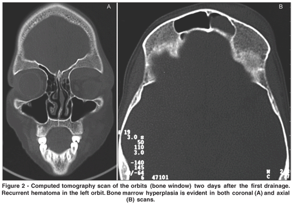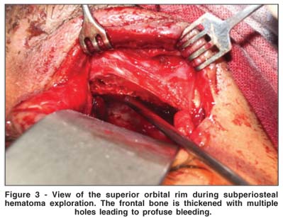 Orbital compression syndrome has already been described in patients with SCD 3, including a first report in the Brazilian literature(4). However, the usual presentation is an acute event dominated by inflammatory signs resulting from bone infarction. In the present case, after a minor trauma the patient presented with an important subperiosteal hematoma without signs of inflammation. Surgical exploration revealed that the frontal bone was abnormally thickened with multiple holes on the orbital rim and along the roof (Figure 3). We believe that this abnormality was caused by the bone marrow hyperplasia found at several skeletal sites including the skull. In normal adults bone marrow is found mainly in the axial skeleton. However, in children with SCD the marrow is expanded into all of the bones. In the skull the typical finding is as an expansion of the diploic space with thinning of both outer and inner tables. This process is an attempt of the organism to increase erythrogenesis and thus represents a response to chronic anemia. Bone marrow hyperplasia, which is usually more severe in sickle cell thalassemia, can be demonstrated by a variety of imaging techniques including scans with radionuclides, magnetic resonance imaging, computed tomography, and plain films(5). In our case bone marrow hyperplasia of the roof was the underlying condition that caused bleeding after the minor frontal trauma. This event is similar to hemarthrosis, an uncommon complication occurring in sickle cell anemia(5). Orbital surgeons should be aware of the fact that orbital bleeding without signs of infarction is due to an intrinsic bone weakening that must be specifically addressed.