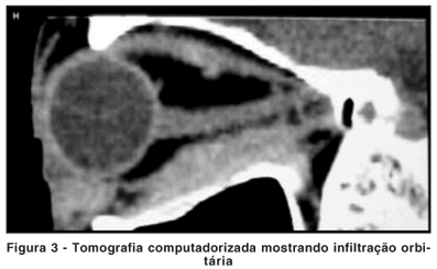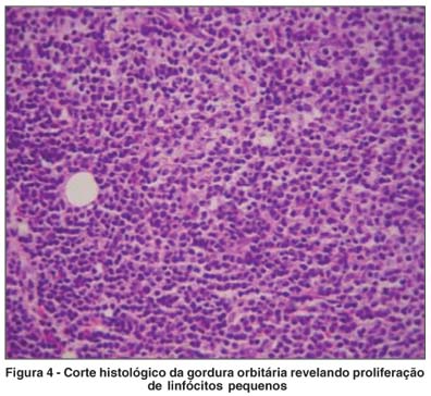 A tomografia computadorizada de órbita revelou infiltração difusa dos tecidos orbitários, aspecto que fala a favor de linfoma. Apesar da tomografia auxiliar no diagnóstico, o exame histológico é o que define o quadro, tendo a biópsia da gordura orbitária revelado LL//LLC, mais especificamente um subtipo que constitui o grupo de baixo grau (classificação Working formulation)(7,9), posteriormente também detectado pela biópsia da medula óssea.