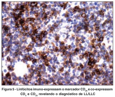 A biópsia de gordura orbitária à direita revelou se tratar de linfoma linfocítico/leucemia linfocítica crônica (LL/LLC) (estudo imunohistoquímico: CD20+; CD5+; CD23+) (Figuras 4 e 5).