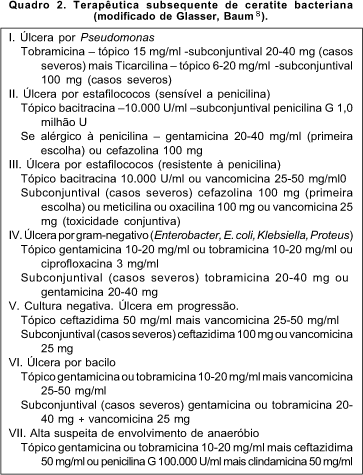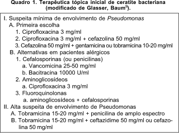 Nos casos de úlceras severas, o tratamento inicial consiste da aplicação tópica de uma combinação de dois agentes fortificados (um com espectro voltado preferencialmente contra gram-positivos e outro contra gram-negativos) (Quadro 1). Uso de antibiótico subconjuntival ou sistêmico está indicado na presença de comprometimento escleral ou intra-ocular 8. Os colírios fortificados devem ser mantidos em geladeira e substituídos frequentemente porque apresentam tempo de validade curto.