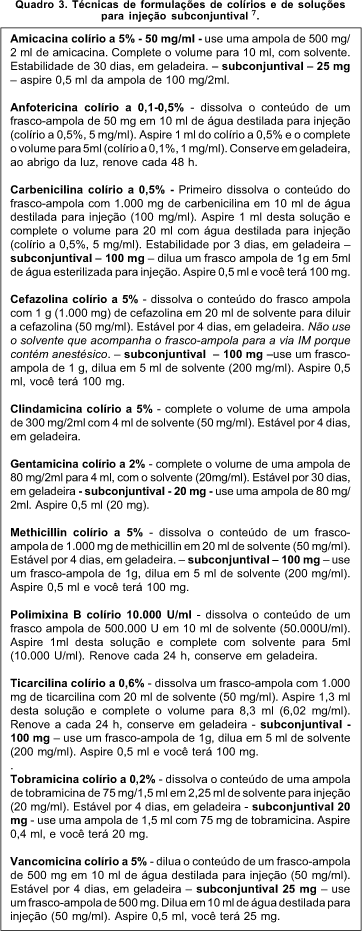 A terapêutica inicial deve ser modificada baseando-se na identificação do organismo ou se há progressão da infecção combinada com resistência demonstrada do organismo aos antibióticos empregados (Quadro 2). As técnicas de preparação de soluções de antibióticos a serem aplicados como colírio fortificado ou como soluções para injeção subconjuntival estão no Quadro 3.