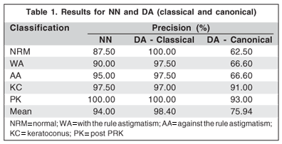 METHODS: The inputs both for the NN and DA were the first 15 standard Zernike coefficients for 80 previously classified corneal elevation data files from an Eyesys System 2000 Videokeratograph (VK), installed at the Departamento de Oftalmologia of the Escola Paulista de Medicina, São Paulo. The NN had 5 output neurons which were associated with 5 typical corneal shapes: keratoconus, with-the-rule astigmatism, against-the-rule astigmatism, "regular" or "normal" shape and post-PRK.