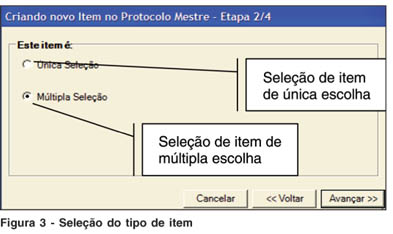 Quando se acrescenta um dado, abre-se uma janela para seleção do tipo de item. Existem duas opções: única ou múltipla escolha (Figura 3). Quando um dado é inserido como seleção única, outros de mesma ordem não podem ser assinalados juntamente a ele durante a coleta. Em contrapartida, dados que podem ser escolhidos com mais de uma alternativa são chamados de itens de seleção múltipla. Como exemplo, durante a coleta de dados de acuidade visual, o investigador pode assinalar apenas um dos itens de única escolha. No programa, os itens de única escolha são visualizados com um círculo (