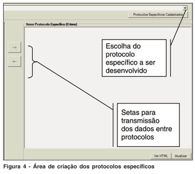 A montagem dos protocolos específicos é simples. A tela aberta para sua criação (Figura 4) possui um botão para seleção de qualquer um dos 19 protocolos cadastrados, e as duas setas na parte esquerda da tela servem para transmissão dos dados desejados para aquela doença.