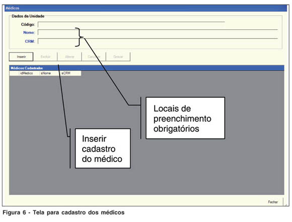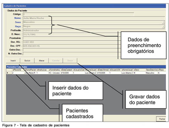O programa possui no seu menu, uma janela que deve ser aberta para o cadastro dos médicos responsáveis pela inserção de dados (Figura 6), assim como outra que é aberta para preenchimento do nome do paciente e de dados que possa identificá-lo (Figura 7). Cada paciente assume um código no programa, e então se elimina a possibilidade de inserção de um mesmo paciente com os mesmos dados duas vezes. O sistema prevê registro obrigatório de três campos em azul que são: nome, sexo e raça, entretanto, bloqueia o cadastro do paciente caso sejam inseridos dados iguais.