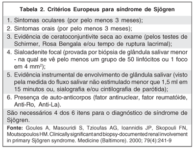 A queixa de secura ocular foi valorizada quando o paciente apresentava as seguintes queixas: (a) sensação de olho seco por mais de 3 meses; (b) sensação recorrente de areia nos olhos; (c) uso de colírio lubrificante por mais do que 3 vezes/dia(10-11). Foi considerado positivo para ceratoconjuntivite seca aquele paciente que apresentou pelo menos um dos seguintes testes alterados: tempo de ruptura do filme lacrimal (BUT; valor normal considerado de até 10 segundos), teste de rosa bengala positivo (valor normal considerado de até 4); e teste de Schirmer diminuído (valor normal considerado acima de 10 mm). Para diagnóstico de síndrome de Sjögren utilizaram-se os Critérios Europeus para síndrome de Sjögren(10-11) (Tabela 2).