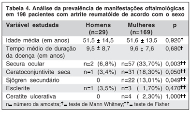 A tabela 5 indica a prevalência das manifestações oftalmológicas de acordo com a positividade do fator reumatóide. Dos 198 pacientes, 190 foram pesquisados para o FR. Destes 135 (71%) eram fator reumatóide positivo e 55 (28,9%) eram fator reumatóide negativos.