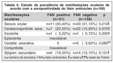 A tabela 6 refere-se a 169 pacientes que possuíam pesquisa para FAN e sua correlação com as manifestações oftalmológicas.