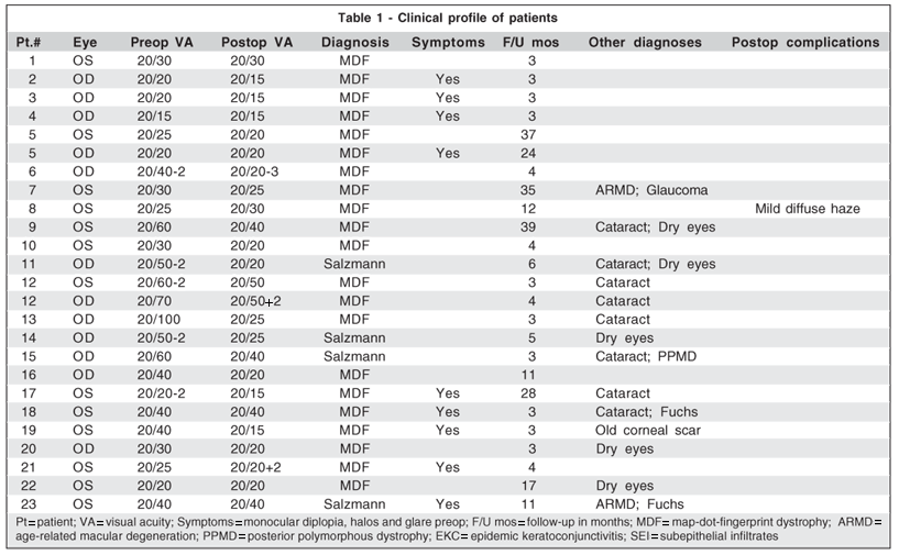 RESULTADOS: Dos 23 olhos avaliados, 19 olhos apresentavam distrofia da membrana basal (map-dot-fingerprint) e 4 degeneração nodular de Salzmann. Todos os pacientes apresentavam diminuição da acuidade visual, assim como graus variados de ofuscamento, halos e diplopia monocular. O seguimento pós-operatório variou entre 3 e 39 meses (média de 10,6 meses) e não houve recorrência da doença original nesse período. O procedimento melhorou a acuidade visual com melhor correção de 20/36 (LogMar 0,250) para 20/24 (LogMar 0,076) com p<0,001. Em relação as mudanças refracionais não houve significância (p=0,232) sendo o equivalente esférico pré-operatório de - 0,36 ± 2,28DE e pós-operatório de -0,71 ± 2,26DE. As queixas de ofuscamento e diplopia monocular diminuíram ou foram eliminadas em todos os pacientes. Apenas 1 paciente apresentou nubécula no estroma anterior com diminuição da acuidade visual com melhor correção de 20/25 para 20/30.