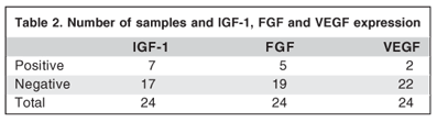 Keywords: Imunohistochemstry; Receptor, erbB-2; Insulin-like growth factor I; Receptor, epidermal growth factor; Epidermal growth factor; Platelet-derived growth factor alpha; Proto-oncogene proteins c-sis; Fibroblast growth factors; Vascular endothelial growth fac