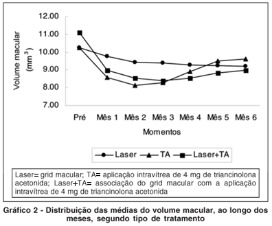 O gráfico 2 mostra a evolução do volume macular. O grupo Laser diferiu dos grupos TA (p=0,0122) e Laser+TA (p=0,0269) em relação ao comportamento ao longo das avaliações. Entretanto, estes dois últimos grupos não apresentaram diferenças significativas entre si tanto em relação aos seus comportamentos (p=0,2581) quanto as suas médias (p=0,7143). Em relação aos valores basais, apenas o grupo Laser não apresentou uma redução significativa do volume macular após tratamento (grupo Laser: p=0,11; grupo TA e grupo Laser+TA: p<0,01).