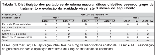 A maioria dos trabalhos publicados, até o momento, sobre o uso da IVTA no edema macular diabético, não apresenta grupo controle e não compara a eficácia das opções terapêuticas existentes, apenas analisam os dados de acuidade visual e espessura macular pré e pós-tratamento. Neste trabalho, estudamos e comparamos três tipos de tratamento para o edema macular diabético. Observamos que o grupo de pacientes submetido à associação da IVTA com o grid macular apresentou um maior percentual de ganho de 10 ou mais letras de visão do que os outros grupos. Estudos maiores são necessários para que se possa definir melhor o papel desta associação terapêutica para a população.