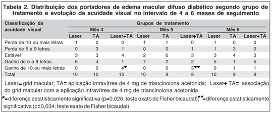 Após distribuição em escala ordinal de ganhos ou perdas de letras de visão, a evolução da acuidade visual também foi testada pelo Teste Exato de Fisher (bicaudal). Este mesmo teste foi utilizado na análise, entre os grupos, da quantidade de pacientes com PIO maior que 21 mmHg ou com elevação pressórica maior ou igual a 5 mmHg após tratamento.
