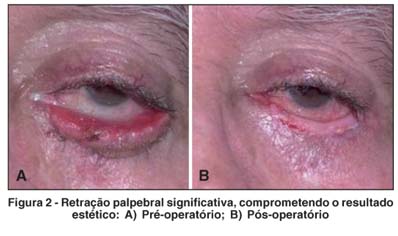 Existem diversas complicações descritas com o enxerto de palato duro e estas podem acometer o sítio doador (sangramento, desconforto local, fístula oro-nasal e infecções) e o receptor (necrose, queratinização e secreção mucóide persistente produzida pelas glândulas salivares presentes no enxerto)(1,12-13). Nesse estudo observou-se um caso de secreção mucóide persistente e outro de retração significativa do enxerto, esse último tratando-se de uma pálpebra comprometida na sua totalidade (Figura 2). Nessa série de casos não foi observada necrose dos enxertos e complicações relacionada aos sítios doadores.