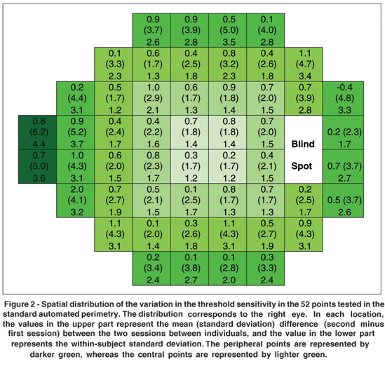RESULTS: The duration of the test was longer in the first session (median, 5.7 min; interquartile range [IQR], 1.7 min) than in the second (median, 5.3; IQR, 1.1 min) (p=0.002). The median (IQR) of false negative errors was 2% (6%) in the first examination and 0% (6%) in the second (p=0.04). The mean (standard deviation) in the mean deviation (MD) global index was -2.31 (1.86) dB in the first examination and -1.73 (1.69) dB in the second (p=0.07). No association was observed between the change in MD and age (p=0.29), gender (p=0.69) and educational level (p=0.27). The changes in threshold sensitivity were greater at the peripheral points than at the central points (p<0.001).