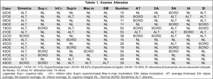 Dos 14 exames alterados, 05 mostraram redução significativa da camada de fibras nervosas (p<10%) apenas superiormente, enquanto 01 apresentou redução superior e nasal e 01 superior e temporal.