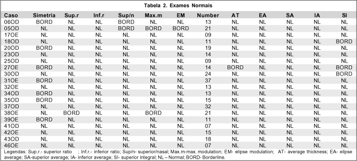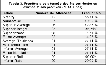 Dentre os exames considerados falsos-positivos, o índice que se mostrou alterado com maior freqüência foi a simetria (85,71 % dos exames alterados), seguida pelo number>30 (50%), superior average (42,85%), superior integral (35,71%), superior/nasal (35,71%), elipse average (14,28%) e average thickness (7,14%). Os índices inferior ratio e superior ratio não apresentaram alteração em nenhum dos casos, e o inferior average e max. modulation em apenas um dos casos (7,14%) (tabela 3).