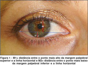 Foi traçada uma linha horizontal, tomando-se por referência o canto medial e o canto lateral. O efeito da fenilefrina 10% sobre a pálpebra superior (PS) foi analisado pela distância entre o ponto mais alto da margem palpebral superior e a linha horizontal (M1) e, sobre a pálpebra inferior (PI), avaliando-se a distância entre o ponto mais baixo da margem palpebral inferior e a linha horizontal (M2) (Figura1).