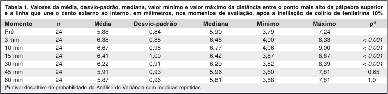 Estudo prospectivo observacional, aprovado pelo comitê de ética da Instituição. Foram selecionados 24 voluntários, com idade entre 20 e 39 anos. Os critérios de exclusão foram: cirurgia ocular e/ou palpebral prévias, ptose ou retração palpebral, exoftalmia, enoftalmia, ametropias com equivalente esférico maior que 5 dioptrias, visão corrigida menor que 20/20 nos dois olhos, hipertensão arterial sistêmica e doença cardiovascular. Foi instilada uma gota do colírio de fenilefrina 10% no fundo de saco conjuntival superior. A aplicação do colírio foi feita de forma aleatória, em um dos olhos.