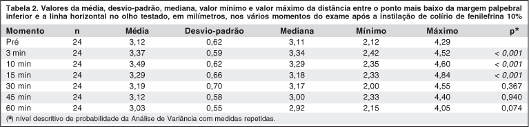 Em relação à PS, a M1 antes da instilação da fenilefrina 10% diferiu significativamente dos demais momentos (p<0,001) com aumento da distância entre a pálpebra superior e a linha traçada (M1), ou seja, houve retração da pálpebra superior até a medida feita após 30 minutos da instilaçào do colírio (Tabela 1). Na PI, esta diferença foi significativa (p<0,001) até 15 minutos após a instilação, ocorrendo aumento da distância entre a pálpebra inferior e a linha traçada (M2), ou seja, houve retração da pálpebra inferior (Tabela 2).