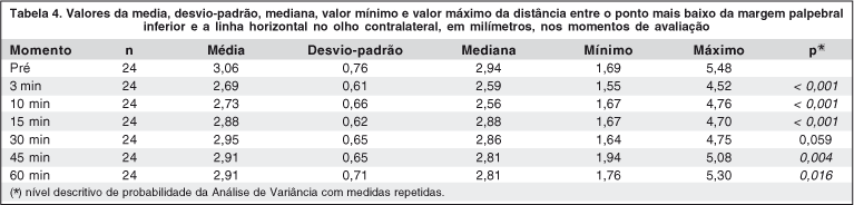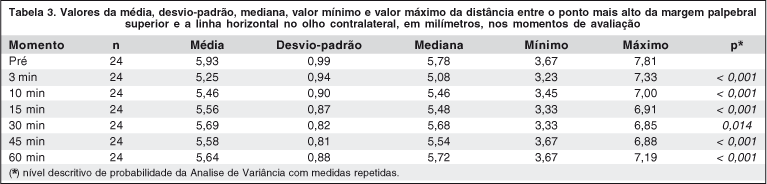 No olho contralateral, as alterações da PS e PI, aos três minutos, diminuíram a fenda palpebral em cerca de 1,05 mm.