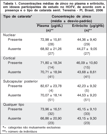 Na tabela 1, verifica-se que não houve diferença significativa quanto às concentrações de zinco eritrocitário entre os idosos com catarata senil, independente do tipo, e os participantes sem a referida condição (p=0,426). Também não existiu diferença significativa no referido parâmetro quanto à presença dos tipos classificados de catarata: N (p=0,967), C (p=0,389) ou P (p=0,597).