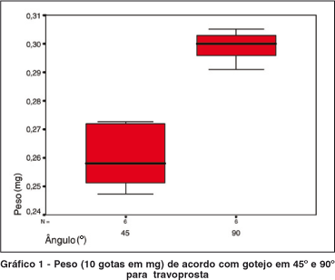 Após análise estatística de variância utilizando teste ANOVA, e adotando-se P<0,001, verificou-se que há diferença estatisticamente significativa no peso das gotas instiladas a 45º e a 90º dos colírios travoprosta e bimatoprosta. Tem-se que para o colírio de travoprosta o gotejo a 45º produz uma gota menor do que a 90º, como pode ser verificado pela análise do gráfico 1.