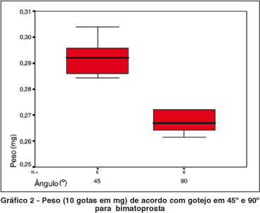 Para o colírio de bimatoprosta ocorre o fenômeno inverso, a menor gota ocorre com instilação a 90º em relação ao plano horizontal (P<0,001), gráfico 2.