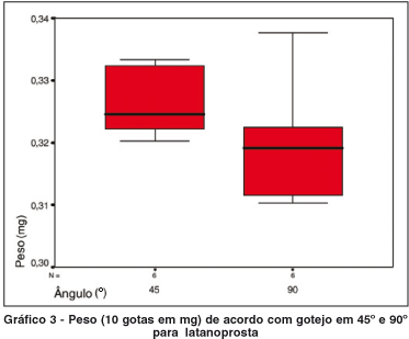 No gráfico 3 é possível se visualizar, por outro lado, que para o colírio análogo da prostaglandina latanoprosta, não houve diferença estatisticamente significante no tamanho da gota, independentemente da angulação utilizada para a instilação (P=0,212).